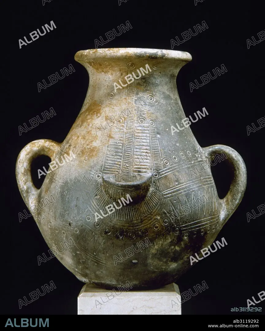 PREHISTORIA. CULTURA NURAGICA. ITALIA. VASO DE CERAMICA CON DECORACION GEOMETRICA, fechado en el siglo VIII a. C. Procede de Santa Anastasia di Sardara. Museo Arqueológico de Cagliari. Cerdeña.