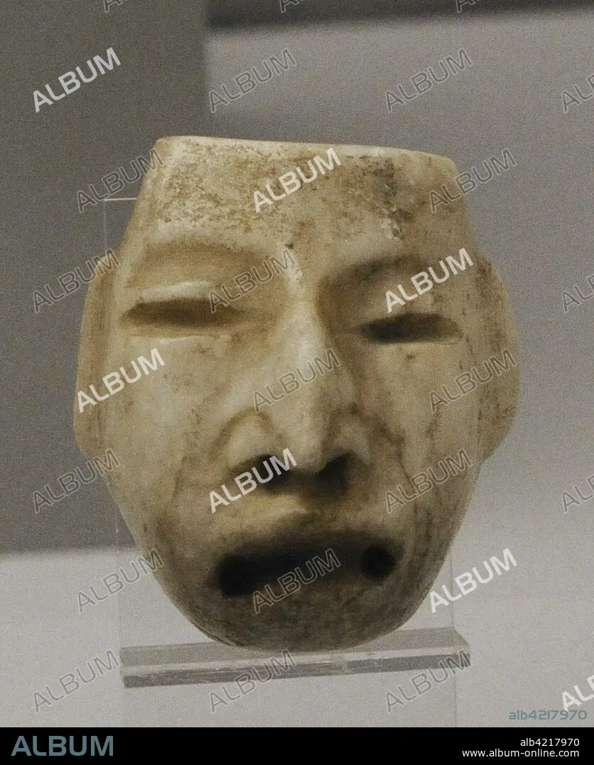 Mascarillla con rasgos humanos. Mármol blanco. Cultura Olmeca. Período Preclásico Medio (1200-400 a. C). México. Costa del Golfo. Museo de América. Madrid. España.