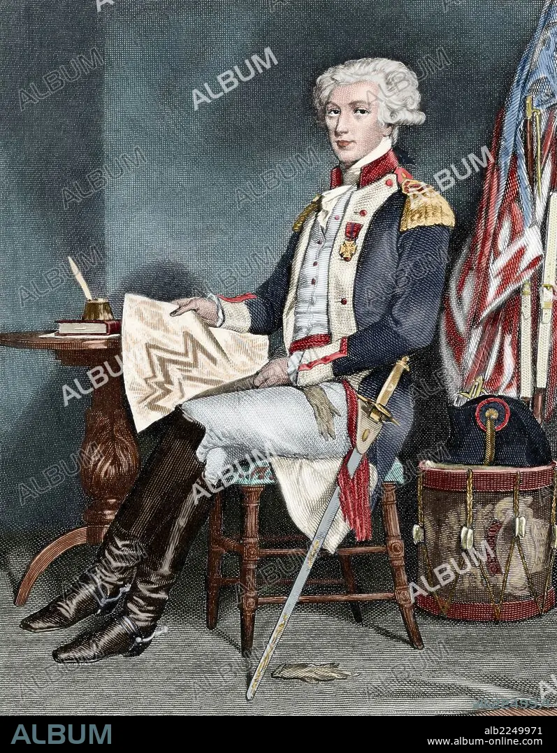 Descripción: LA FAYETTE, Marie-Joseph-Paul-Yves-Roch-Gilbert Motier, marqués de (Chavaniac, 1757-París, 1834). Político francés. Destacó por su ayuda a los colonos americanos en su lucha por la independencia. De vuelta a Francia desempeñó un importante papel durante los primeros años de la Revolución como monárquico liberal. Grabado coloreado.