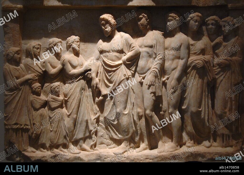ARTE GRIEGO. S. V-IV. GRECIA. RELIEVE VOTIVO en mármol pentélico con ASCLEPIOS CON SUS HIJOS MACHAON Y PODALEIRIOS Y SUS HIJAS IASO, AKESO Y PANAKEIA. A su izquiera, FAMILIA DE ADORADORES PORTANDO UN CERDO PARA EL SACRIFICIO. Al fondo, sus CRIADAS CON UN CESTO TAPADO CON ROPA. Probablemente procede de Loukou (Acadia) y está datado entre 400-350 a. C. Museo Arqueológico Nacional. Atenas. Grecia.