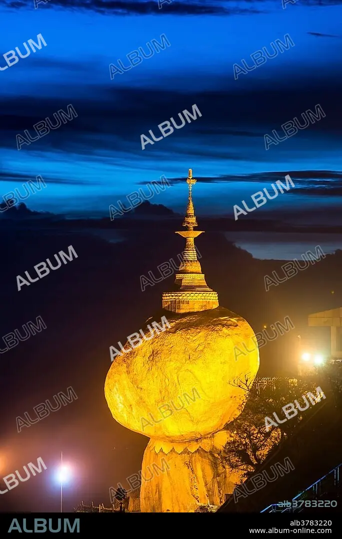 Golden Rock at dusk with Kyaiktiyo Pagoda, Kyaikto, Thaton District, Mon State, Myanmar, Myanmar, Asia.