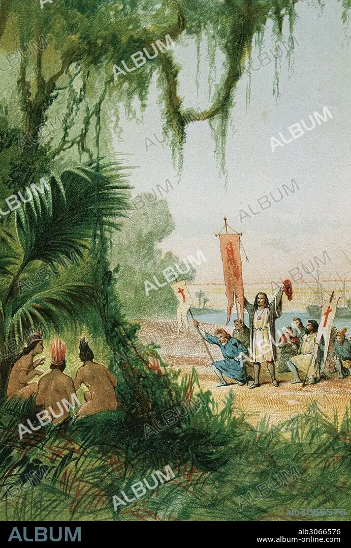 Descripción: COLON, Cristóbal (Génova,1451-Valladolid,1506). Navegante al servicio de los Reyes Católicos. Descubridor de América. "DESEMBARCO DE COLON EN LA ISLA DE SAN SALVADOR (GUANAHANI), el 12 de octubre de 1492". Tomando posesión en nombre de los Reyes Católicos de la nueva tierra descubierta. Ilustración del año 1878.