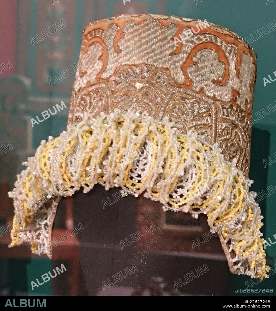 Kokoshnik. Women's headdress. Tver province. Late 18th - early 19th centuries. Velvet, chintz, linen, gold thread, silver thread, metallic sequins, mother-of-pearl, beads, foil, embroidery, stringing, weaving. All Russian Decorative Art Museum.