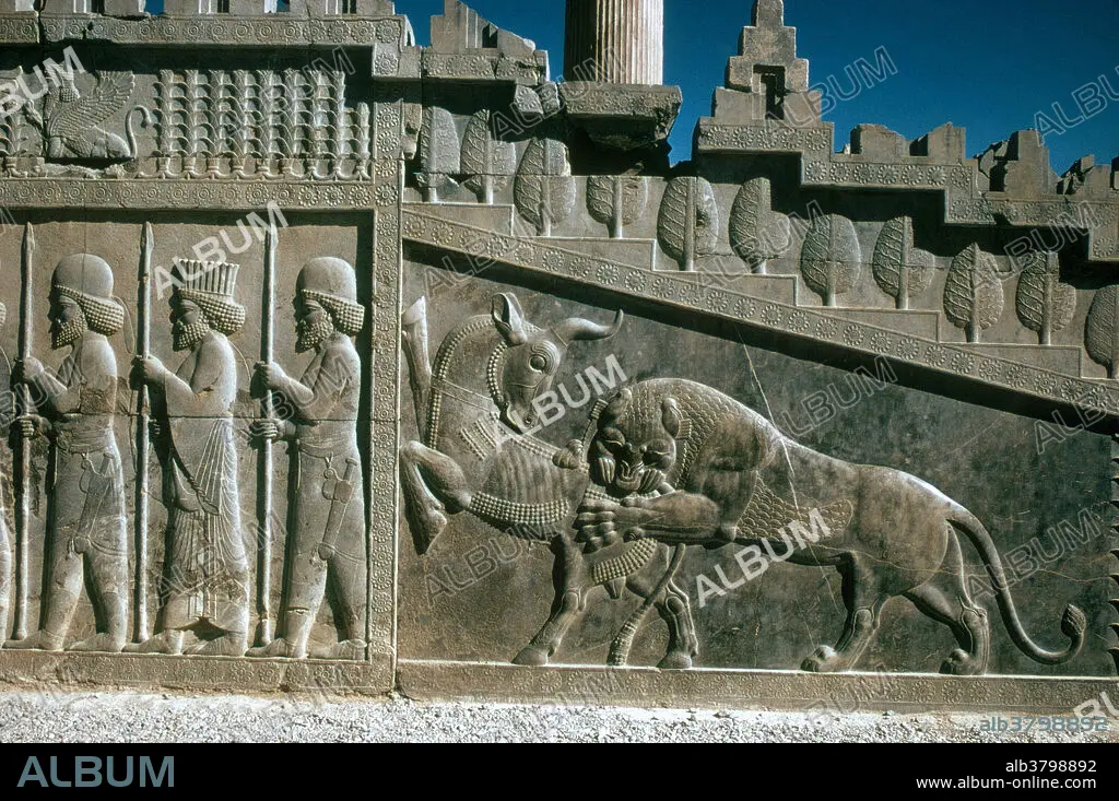 A relief depicting a lion attacking a bull, on the eastern staircase of Apadana Palace, at Persepolis, Iran. Persepolis was once the capitol of the Persian Empire, and dates from about 500 BC. The lion attacking the bull represents the coming of spring. Pesepolis was founded by Darius the Great around 518 BC and destroyed by Alexander the Great. The ruins lie about 500 miles south of Tehran.