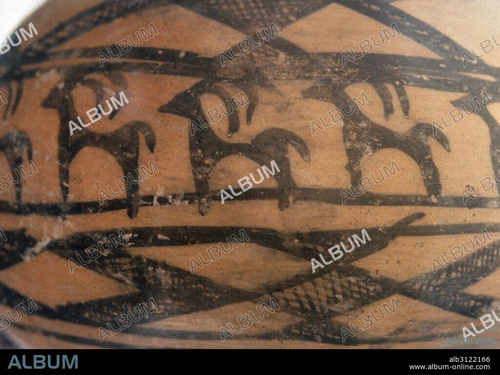 PREHISTORIA. IRAN. Detalle de una VASIJA DE CERAMICA decorada con dibujos geométricos y un friso central con decoración zoomorfa representando CABRAS. Fechada en el V milenio antes de Cristo. Procede de Ismail Abad (Zandján), al norte de Irán. Museo Arqueológico Nacional. Teherán. República Islámica de Irán.