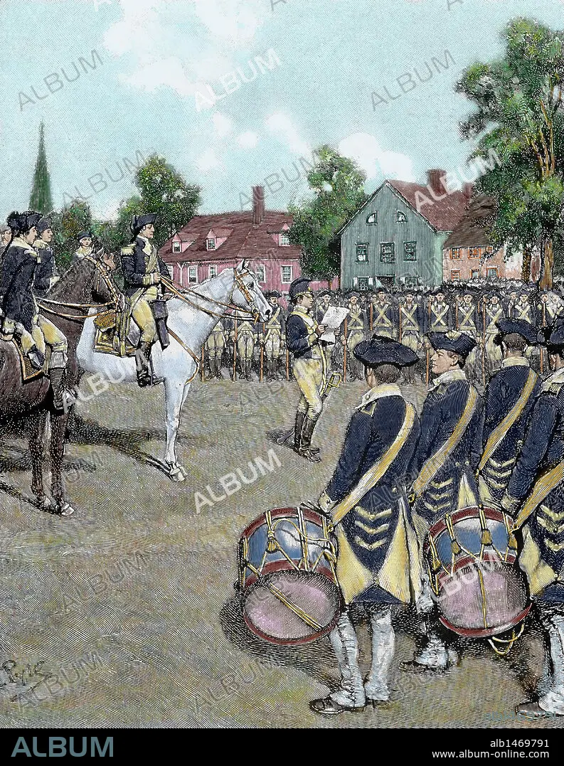 GUERRA DE LA INDEPENDENCIA AMERICANA (1775-1783). DECLARACION DE INDEPENDENCIA: El ejército del general WASHINGTON en Nueva York, el 9 de julio de 1776. Grabado por Howard Pyle, año 1892. Coloreado.