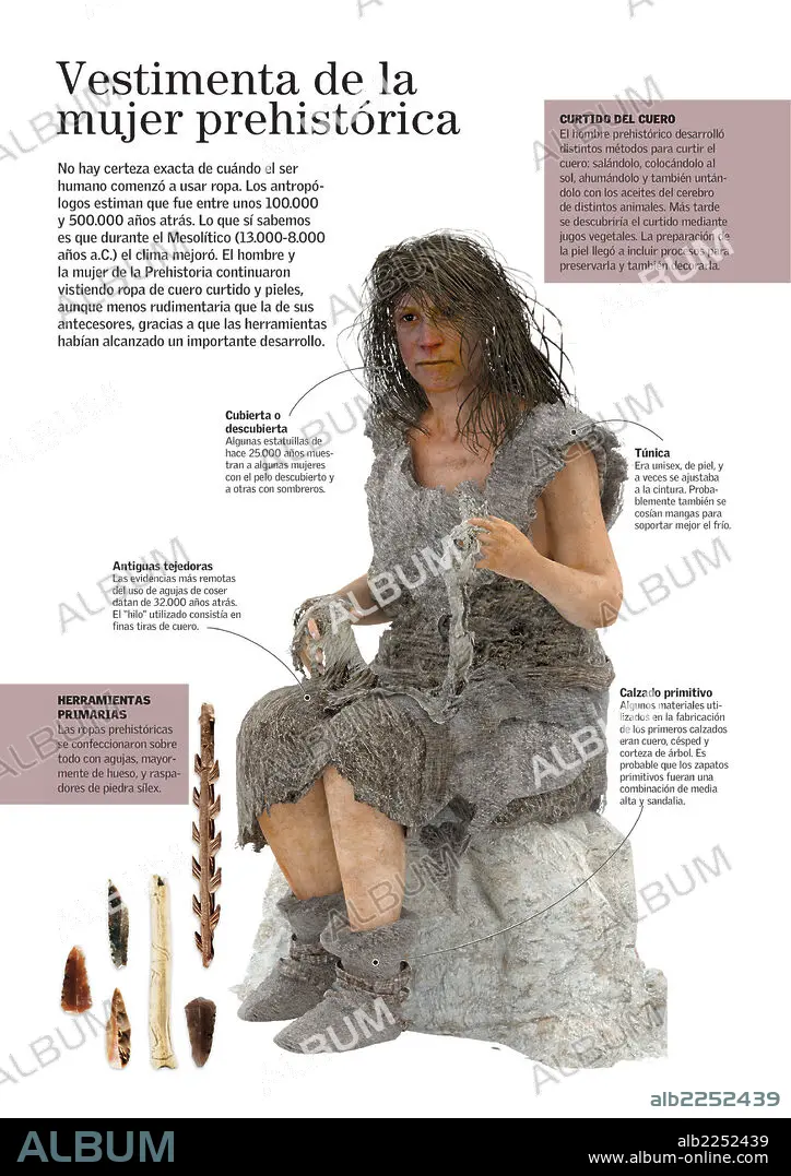 Descripción: Infografía sobre la vestimenta típica de las mujeres del Mesolítico (período de la Prehistoria que sirve de transición entre el Paleolítico y el Neolítico).