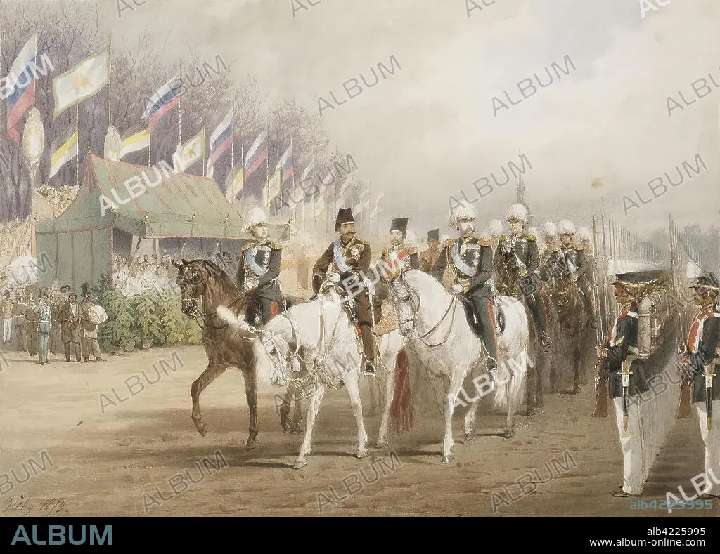 '"Alexander II and Nasir al-Din Shah during the Parade in the Field of Mars"'. Series "Nasir al-Din, Shah of Persia, visiting St Petersburg in 1873". Russia, 1873. Dimensions: 25,8x35,7 cm.