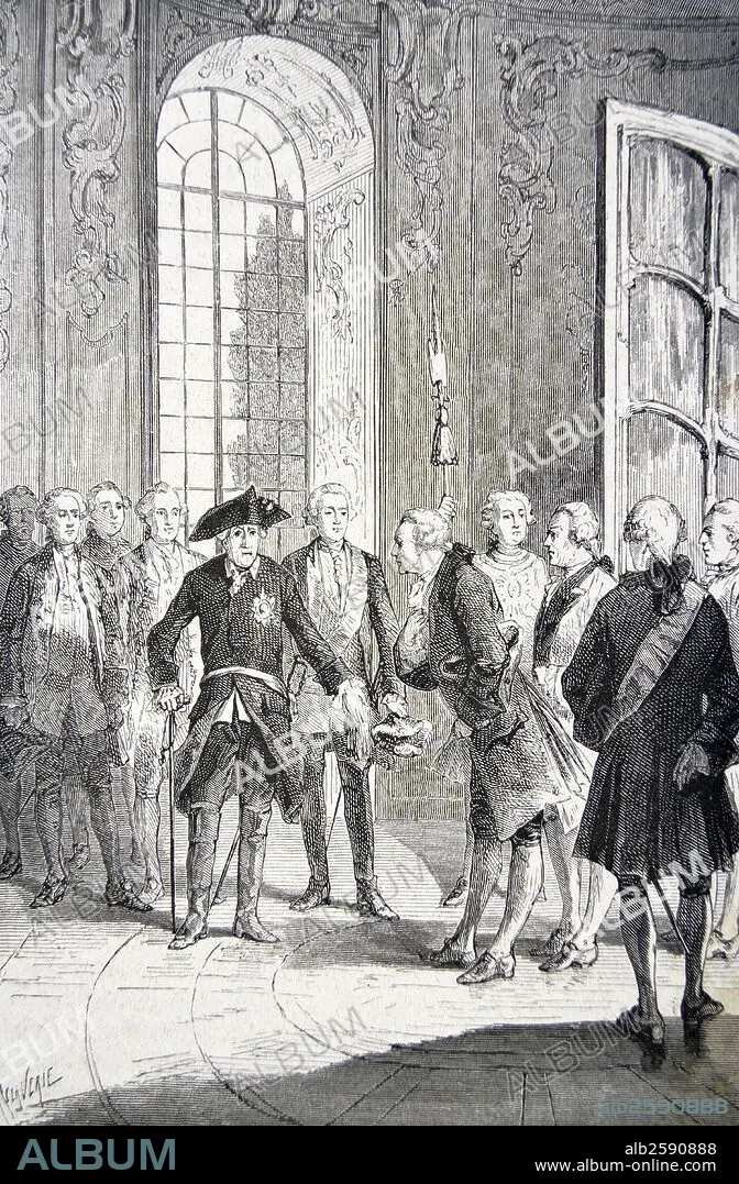 Jean le Rond d'Alembert (1717-1783) French scientist and philosopher: co-editor with Diderot of the ''Encyclopedie', received by Frederick the Great in Berlin. Engraving, Paris, 1874. Photo by: .