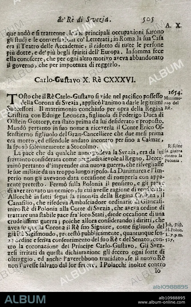 Descripción: "Mappamondo Istorico". Tomo V. Parte segunda. Vida de los reyes de Suecia, desde el comienzo de la monarquía hasta el año 1702. Capítulo IV. Dedicado a Carlos X Gustavo (1622-1660), rey de Suecia (1654-1660). Obra del padre Antonio Foresti (1625-1692), de la Compañía de Jesús. Parma, 1709.