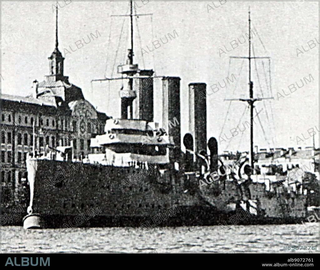 Russian battleship Aurora during the October Revolution of 1917. The crew joined the February Revolution of 1917. On October 25, 1917, at 9:40 pm, a blank shot from her guns was the signal for the start of the storming of the Winter Palace, which was to be the beginning of the October Revolution.