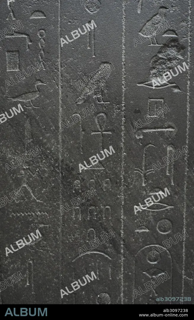 Descripción: Sarcófago de Taperet. 664-525 a. C. Dinastía XXVI. Su nombre está inscrito en la tapa. Textos de las Pirámides inscritos a los lados. La tapa está decorada con cuatro columnas de texto. Detalle de los jeroglíficos. Museo del Mediterráneo y Antigüedades del Oriente Próximo (Museum of Mediterranean and Near Eastern Antiquities). Estocolmo. Suecia.