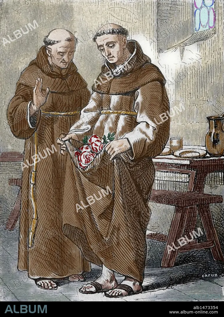 Descripción: PEDRO REGALADO, San (Valladolid,1391-?,1456). Religioso franciscano español. Estaba el Santo empleado en el oficio de portero en el convento de Abrojos, y era tanto lo que daba de limosna que llegaron los religiosos a murmurarlo, y solicitar del guardián que pusiese oportuno remedio. Grabado coloreado.