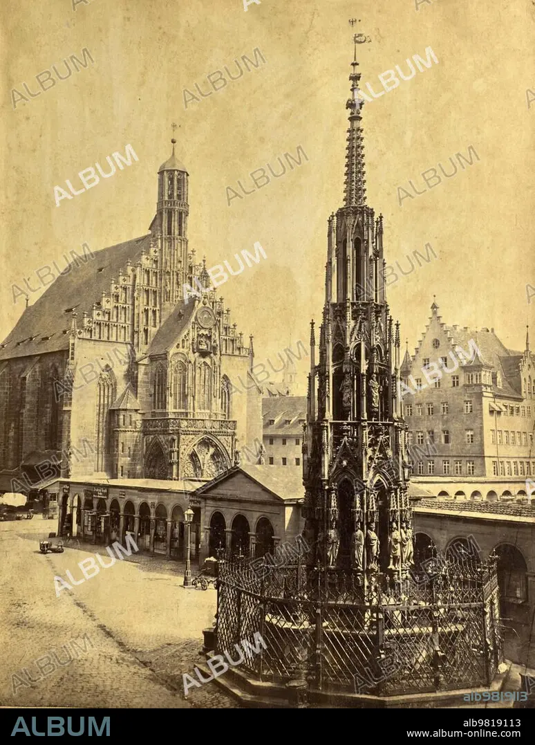 The Church of Our Lady and Beautiful Fountain; 1870; Nuremberg; Bavaria; Germany; Historical; digitally restored reproduction from a 19th century original; Europe