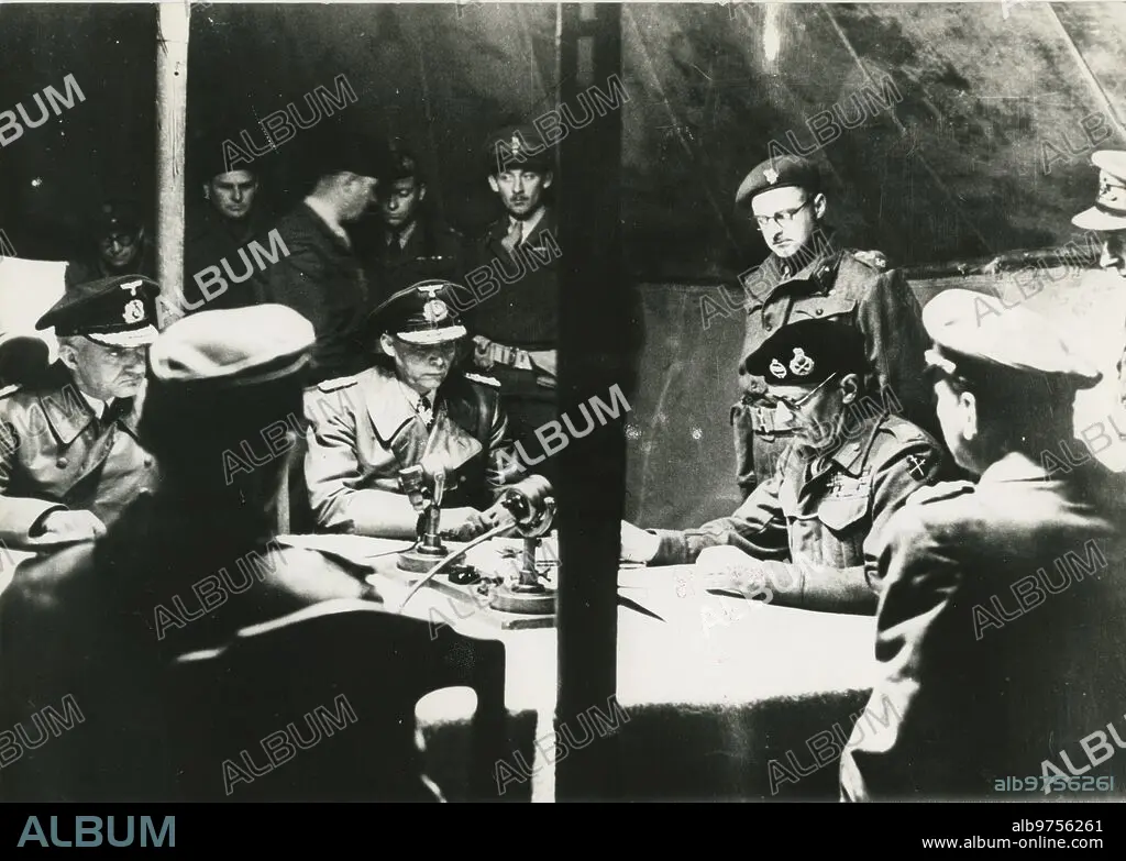 Descripción: Luneburgo (Alemania), 04/05/1945. Segunda Guerra Mundial. Rendición de Alemania. Lord Montgomery lee los términos de rendición a los representantes de las fuerzas armadas alemanas. Los almirantes son Wagner y Von Friedeburg y de espaldas, el mayor Friedal y el coronel Poleck