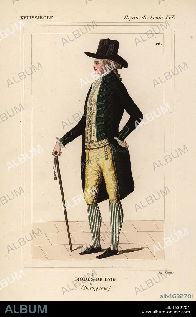French men's fashions of 1789 (bourgeois) in imitation of the English style. Hair a la Panurge and hat a la Jackei. Handcoloured lithograph from Le Bibliophile Jacob aka Paul Lacroix's Costumes Historiques de la France (Historical Costumes of France), Administration de Librairie, Paris, 1852.