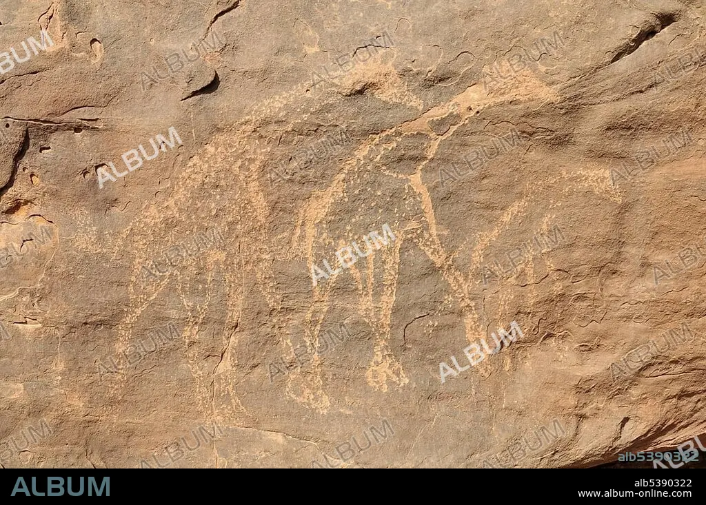 Giraffe engraving, neolithic rock art of the Tadrart, Tassili n'Ajjer National Park, Unesco World Heritage Site, Algeria, Sahara, North Africa, Africa.