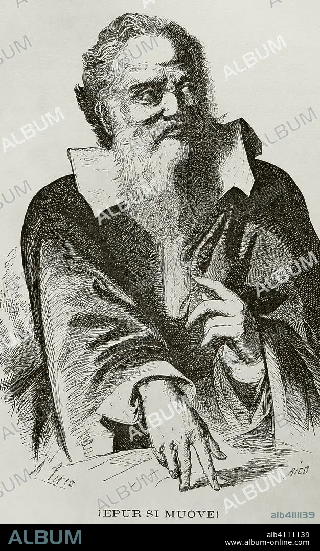 Descripción: Galileo Galilei (1564-1642). Astrónomo, filósofo, ingeniero, matemático y físico italiano, relacionado con la revolución científica. "E pur si Muove" (y, si embargo, se mueve). Famosa frase que pronunció después de abjurar de la visión heliocéntrica ante el tribunal de la Santa Inquisición. Grabado por Rico. Crónica General de España, Historia Ilustrada y Descriptiva de sus Provincias. Castilla-La Nueva, 1869. Biblioteca Histórico Militar de Barcelona, Cataluña, España.