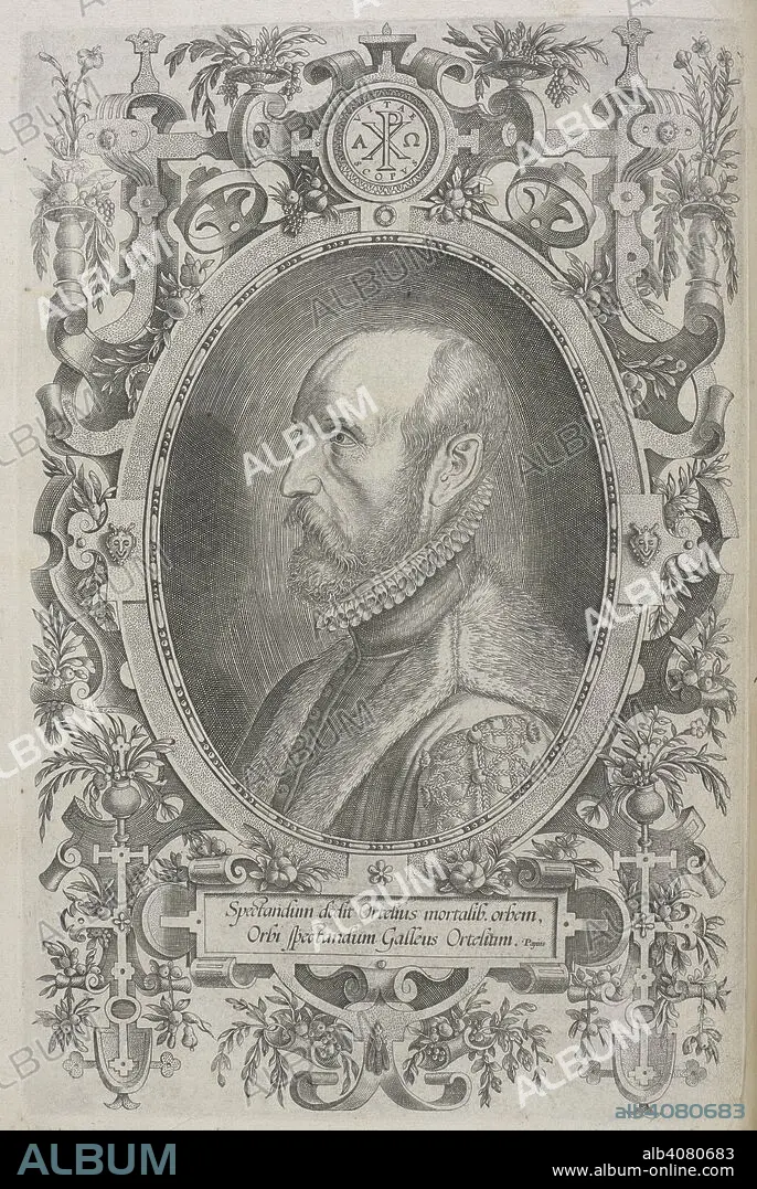 Abraham Ortelius (Ortels), (14 April 1527 – 28 June 1598). A Flemish cartographer and geographer. . Theatrvm Orbis Terrarvm. (Theatrum Orbis Terrarum.). Anvers : De l'Imprimerie de Christofle Plantin, pour Abraham Ortel, autheur mesme de ce liure, 1587. Line engraving. Source: Maps.C.2.d.2 frontispiece.
