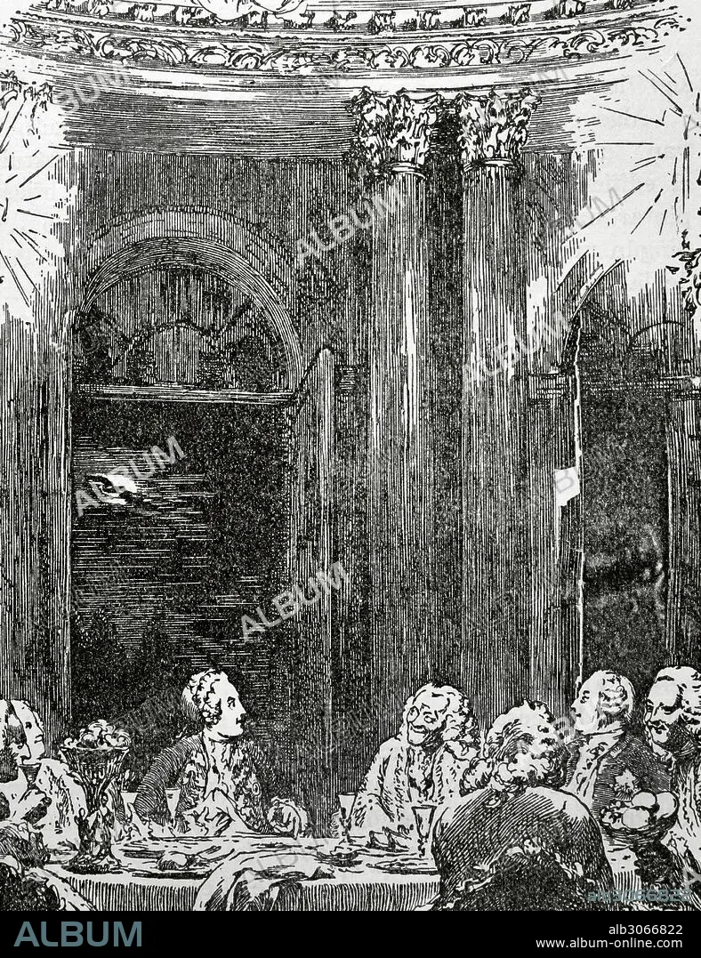 Descripción: FEDERICO II "el Grande" (1712-1786). Tercer rey de Prusia desde 1740, perteneciente a la Casa Hohenzollem. Persona ilustrada que engrandeció y modernizó Prusia. "Mesa redonda de Federico el Grande, en Sanssouci". Grabado en madera del pintor alemán Adolph Menzel (1840-1841) .