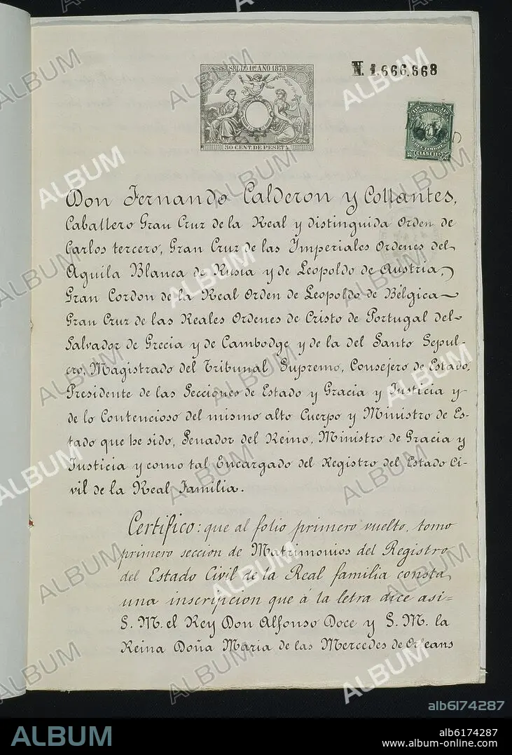 FERNANDO CALDERON COLLANTES CERTIFICA LA INSCRIPCION DE ALFONSO XII Y MARIA DE LAS MERCEDES EN EL REGISTRO CIVIL DE LA FAMILIA REAL - SIGLO XIX