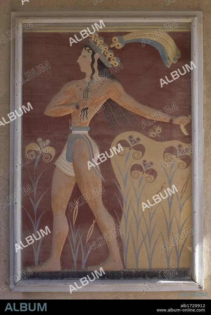 ARTE MINOICO. GRECIA Fresco del "PRINCIPE DE LOS LIRIOS". Reproducción del original del Museo de Heraklio. Representa un hombre joven, togado con una amplia tiara, un típico faldón corto y un collar de cuentas en forma de flor de lis. Relieve de estuco pintado. Alto: 1,20 m. Ala Occidental del Palacio de Cnosos. Fechado hacia el 1450-1400 a. C.). CRETA.