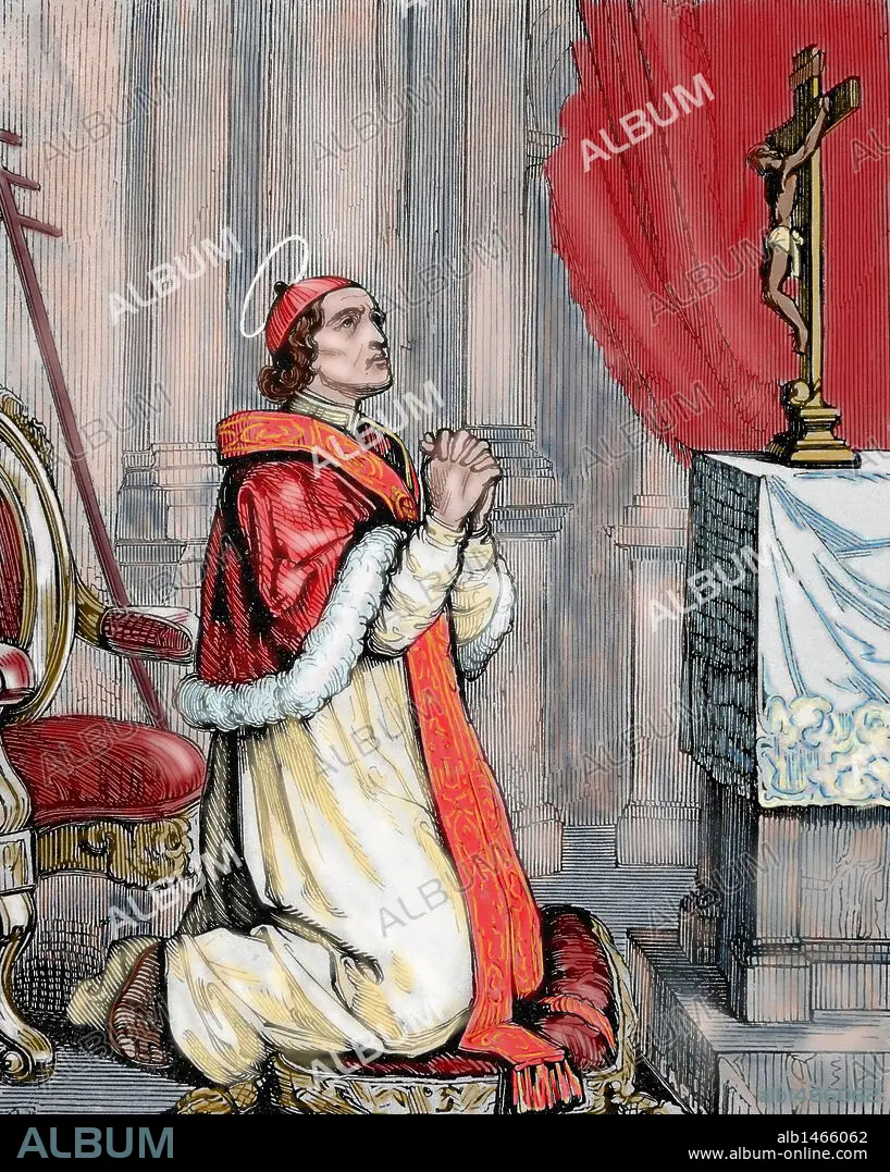 Descripción: PIO V, San (Bosco,1504-Roma,1572). Papa italiano, de nombre Antonio Ghislieri. Elegido en 1566, era cardenal (1557). Pertenecía a la Orden Dominicana. Mantuvo tensión constante con Felipe II de España, por su intervencionismo en materia eclesiástica. Patrocinó la formación de la escuadra que venció a los turcos en Lepanto (1571). Grabado por Capuz. Coloreado.
