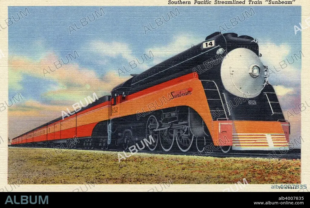 Southern Pacific streamlined train 'Sunbeam', USA, 1937. Vintage postcard. The 'Sunbeam' was a train that ran between Houston and Dallas, Texas, from 1925 until 1955. The streamlined trains were introduced on the service in 1937.