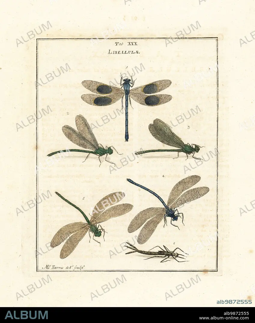 Banded demoiselle, Calopteryx splendens male 1, female 3, beautiful demoiselle, Calopteryx virgo var. anceps male 2, female 4, C. virgo or splendens female 5, nymph 6. Libellula splendens 1,2,3, and Libellula splendeo 4.5.6. Handcoloured copperplate engraving drawn and engraved by Moses Harris from his own Exposition of English Insects, Including the several Classes of Neuroptera, Hymenoptera, Diptera, or Bees, Flies and Libellulae, White and Robson, London, 1782.