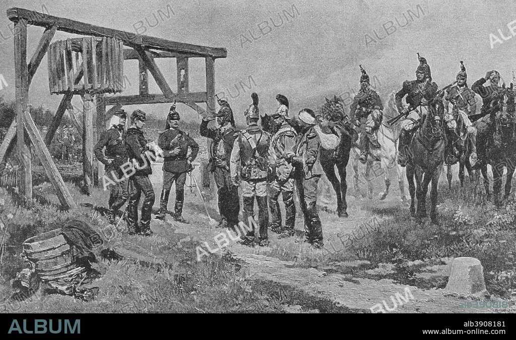 Guerra Franco-Prusiana (1870-1871). Regreso de un reconocimiento. Grabado. Original por Edouard Detaille (1848-1912). En Campagne, por Jules Richard. Obra editada en París en 1885. Biblioteca Histórico Militar de Barcelona. Cataluña. España.