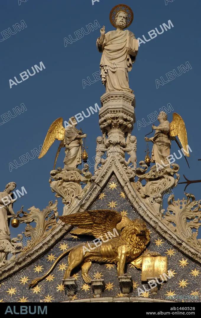ITALIA. VENECIA. Detalle de la ESCULTURA DE SAN MARCOS y, en la parte inferior, su representación como evangelista, el LEON DE SAN MARCOS. Situados en la fachada de la BASILICA DE SAN MARCOS. Véneto.