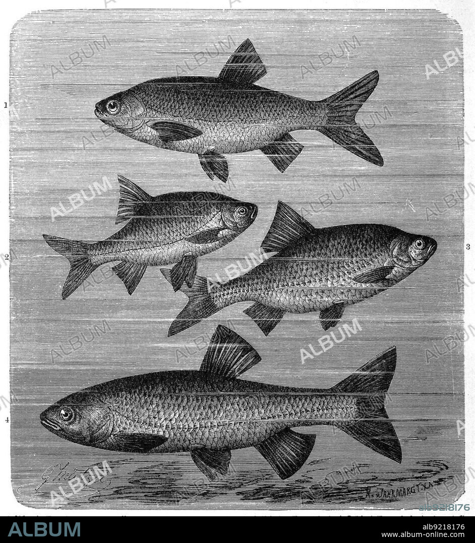 Fish, 1. aland, also called orfe (Leuciscus idus) or ide (fish), species of fish in the carp family, 2. roach (Rutilus rutilus), roach, loggerhead or the swallow, Leuciscus erythrophthalmus, 3. roach, loggerhead, Leuciscus rutilus, 4. Chub (Squalius cephalus), syn. Leuciscus cephalus, also called eel, vanity or aitel, fish species from the order of carp, Historic, digitally restored reproduction from a 19th century original