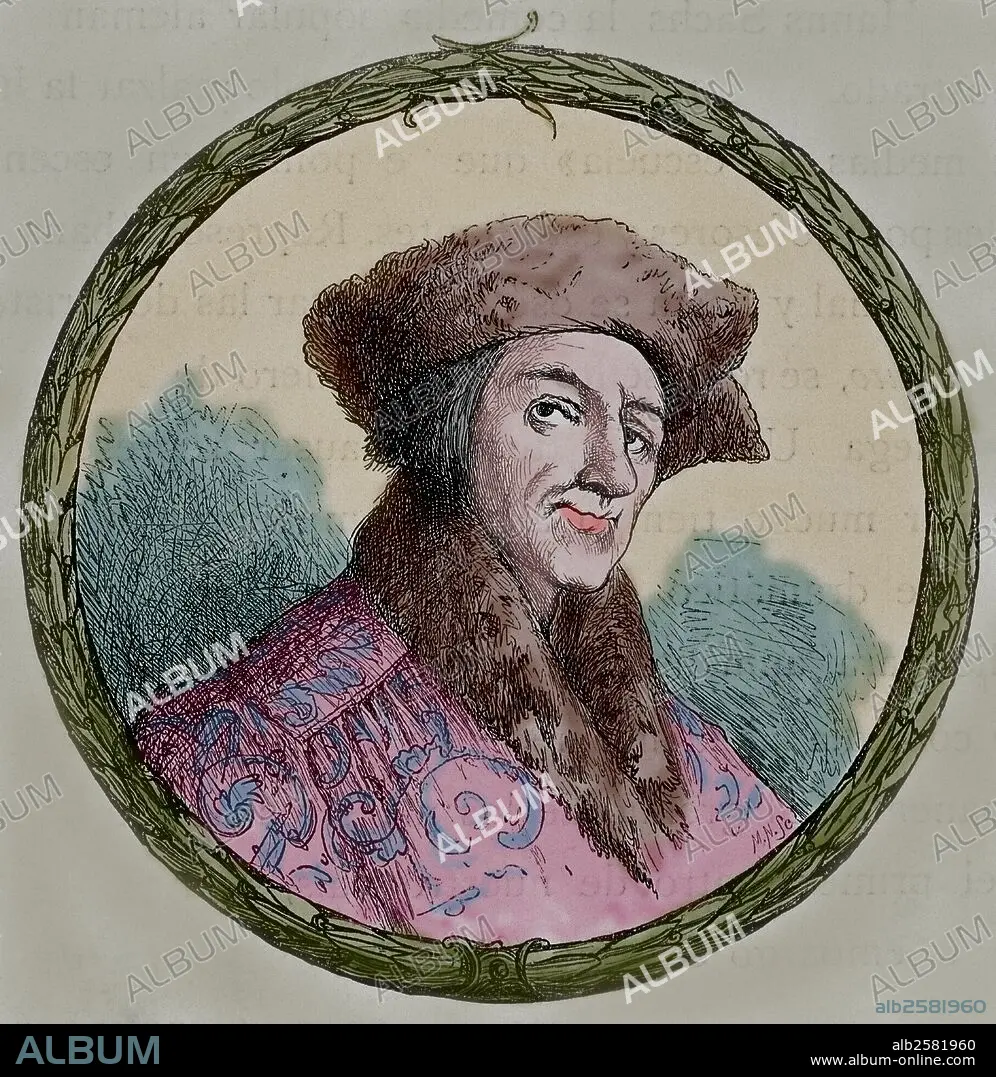 Descripción: FISCHART, Johann (Estrasburgo,1546-Forbach,1590). Humanista alemán, autorde libelos en contra de la Iglesia Católica y de los Jesuítas. Grabado coloreado.
