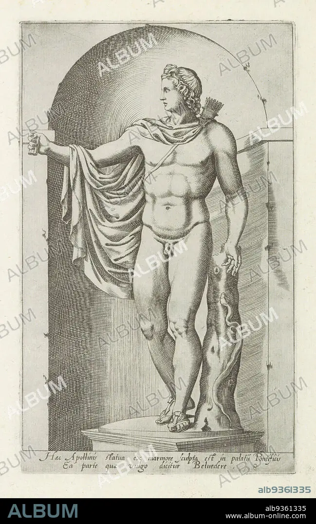 Sculpture of Apollo, Apollo Belvedere, Haec Apollinis statua ex marmore sculpta est in palatij pontificis (...) (title on object), Antique sculptures in Rome (series title), Antiquarum statuarum urbis Romae quae in publicis locis visuntur icones (series title), Caption in Latin. Print is part of an album., print maker: anonymous, publisher: Andrea Vaccari, print maker: Italy, publisher: Rome, 1584, paper, engraving, height 222 mm × width 134 mm