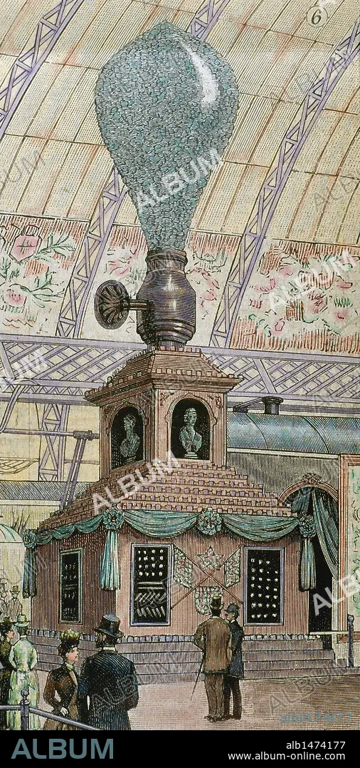 Lámpara incandescente gigante, doce pies de altura, montada en un pedestal coronado por un modelo de la bombilla de Edison, aumentada 20.000 veces. Se mostró como uno de los inventos de Thomas Edison (1847-1931) en la Exposición Universal de París en 1889. Grabado publicado en "La Ilustración Española y Americana" en 1889. Coloreado.