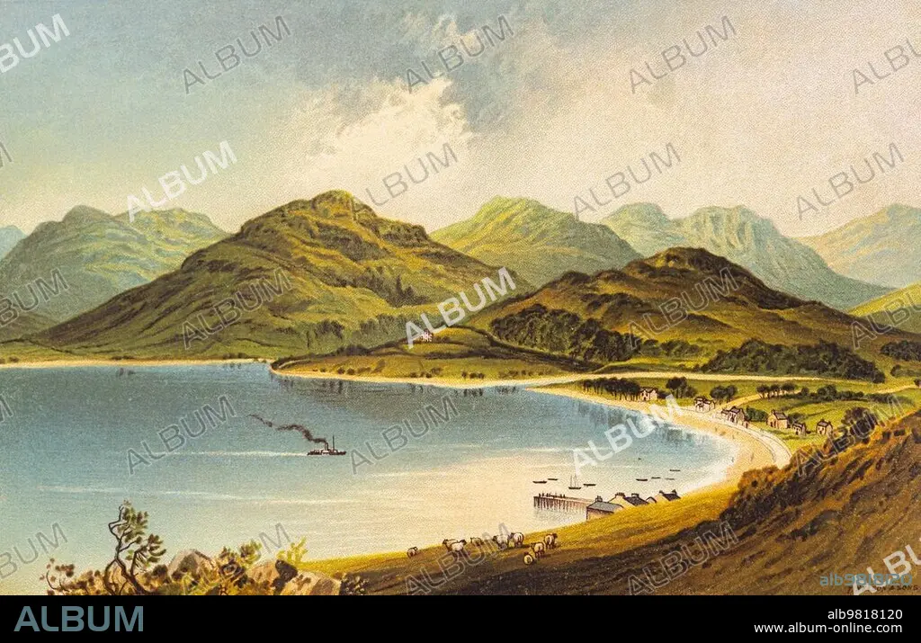 Loch Goil Head; southern highlands; fjord; mountain landscape; beach; shore; building; jetty; steamboat; nature; solitude; tranquillity; trees; sheep; colour historical illustration 1889; Scotland; Great Britain