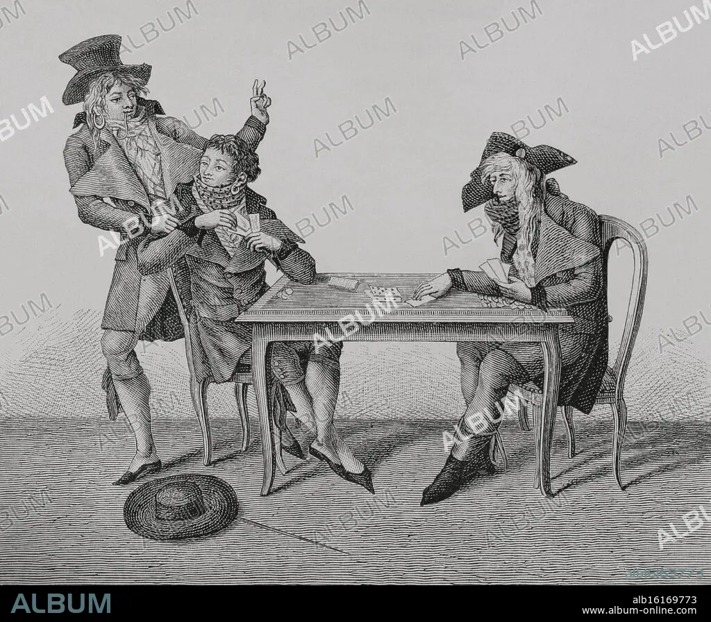 Descripción: Francia. "Les Croyables au tripot". Hombres jugando a las cartas, finales del siglo XVIII. Tramposos desplumando a una víctima durante una partida de cartas. Los tres visten al estilo "incroyable", con grandes sombreros, chalinas altas, redingotes con grandes solapas, calzones y botas. Ilustración por Louis Leopold Boilly (1761-1845). Grabado por Salvatore Tresca (h. 1750-h. 1815), marzo de 1797. "Directoire, Consulat et Empire. Moeurs et usages, lettres, sciences et arts. France, 1795-1815" (Directorio. Consulado e Imperio. Costumbres y tradiciones, letras, ciencias y artes. Francia, 1795-1815), por Paul Lacroix. Publicado en París, 1884.