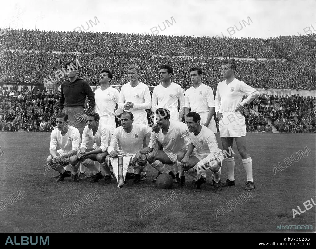 7 mayo 1959. Partido de copa de Europa entre el real Madrid y el Atletico de Madrid donde el Madrid Perdio por 1 A 0. En la foto y en la fila de Atras: Dominguez, Miche, Santamaria, Lesmes, Santisteban y Ruiz. Delante: Kopa, Mateos, Di Stefano, rial y Gento