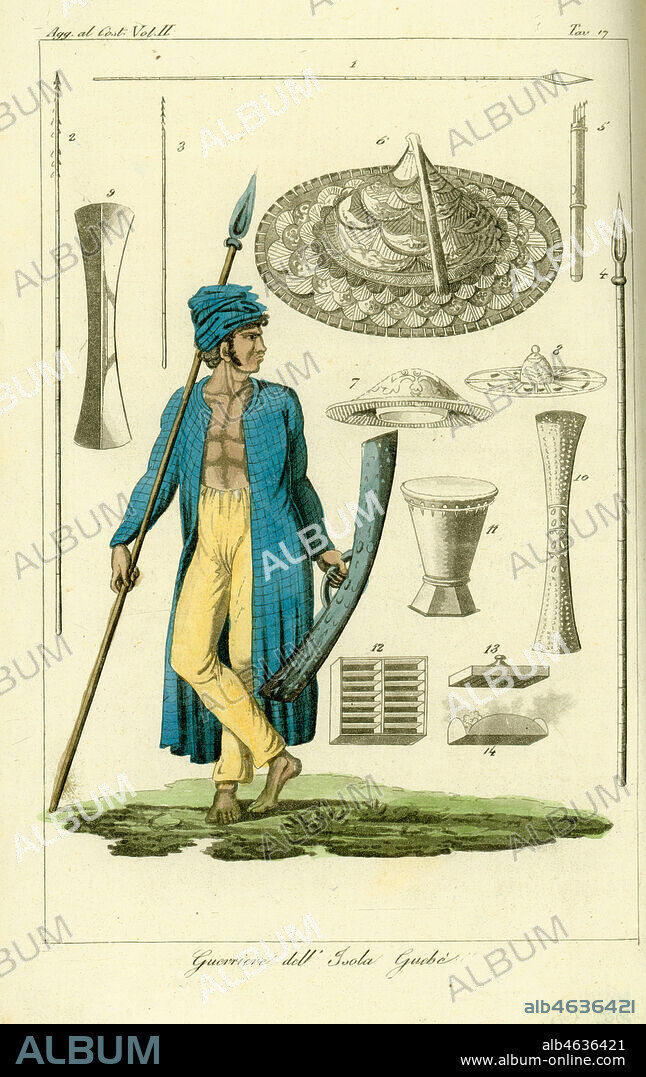 Warrior from the island of Guebe, Maluku Islands, Indonesia, 19th century. He wears a turban, long coat over trousers and carries a spear and shield. Weapons and musical instruments. Handcoloured copperplate engraving by Corsi after Jacques Arago from Giulio Ferrario's Costumes Ancient and Modern of the Peoples of the World, Florence, 1834.