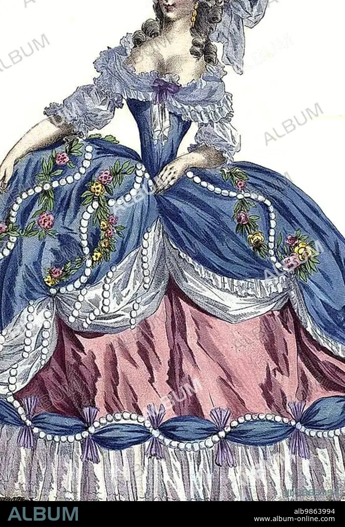 Marie Antoinette, French queens were expected to be role models when it came to fashion. As the woman of Louis XVI, Marie Antoinette dedicated herself to this task with enthusiasm. Together with her Marchande de Modes Rose Bertin and her hairdresser Léonard, she launched many a new fashion. Court etiquette dictated robes de cour, lavishly decorated dresses with wide skirts, Paris, 1787, France, Historic, digitally restored reproduction from an original au