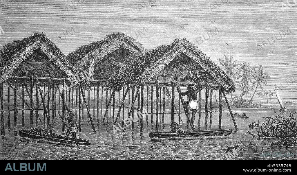 Pile huts of the Goajiro Indians in the lake of Maracaibo, Venezuela, in 1870 / Pfahlhütten der Goajiro-Indianer im See von Maracaibo, Venezuela, im Jahre 1870, Historisch, historical, digital improved reproduction of an original from the 19th century / digitale Reproduktion einer Originalvorlage aus dem 19. Jahrhundert,.