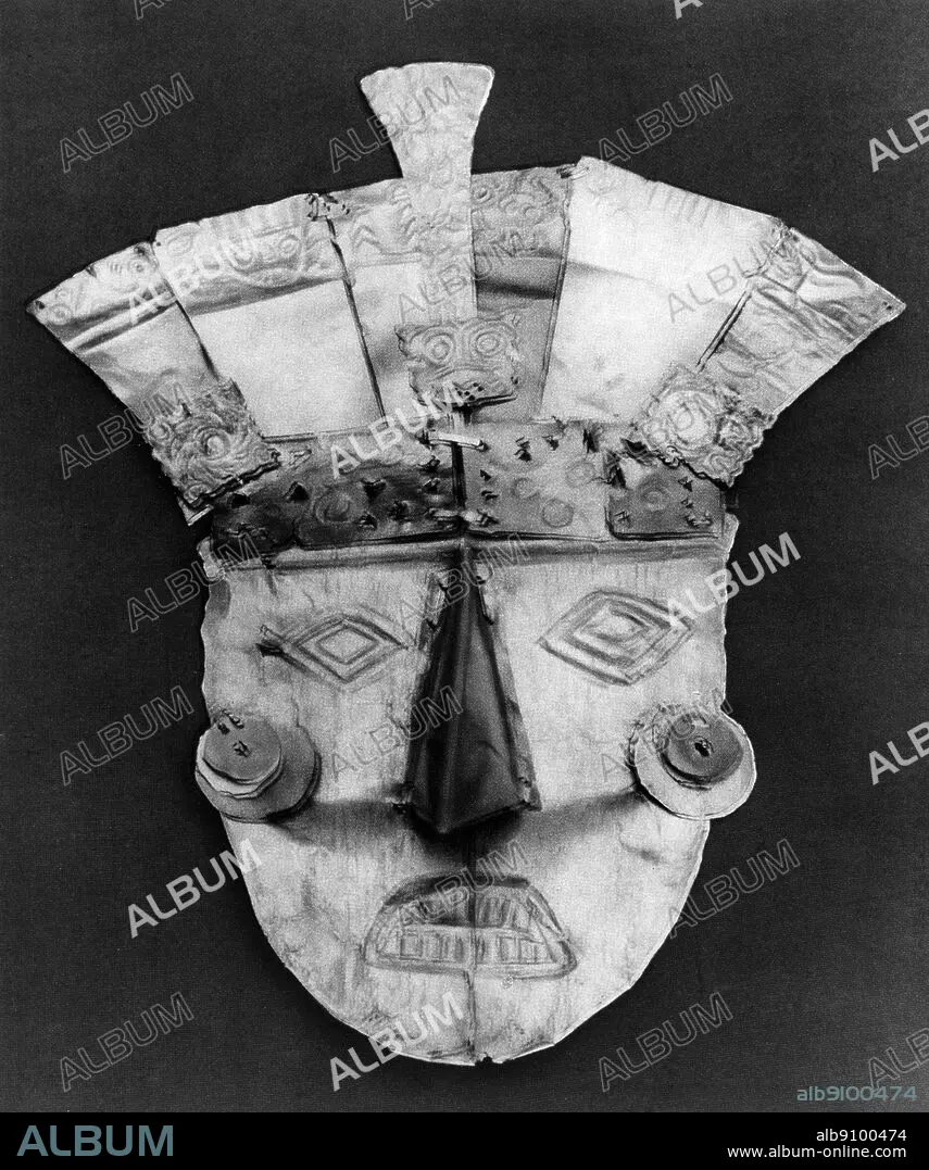Funeral mask , Nazca culture , Peru , South America .7th or 8th Century . Height 12 5/8 inches or 32 cm. The Mujica Gallo Collection , Lima.