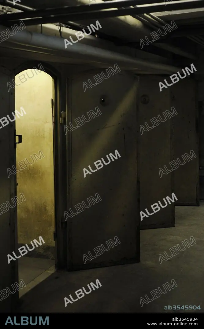 Descripción: Centro de Documentación del Nacionalsocialismo. Museo Memorial de la Prisión de la Gestapo en la EL-DE House. Fundado en 1979. Fue la oficina central de la Policia Secreta del Estado (Gestapo) entre 1935 y 1945. Vista del sótano. Detalle del lugar donde, en 1943, se instaló una celda oscura de 2,4 metros cuadrados con un banco de piedra utilizada para interrogatorios donde los prisioneros eran golpeados y torturados. Colonia. Alemania.