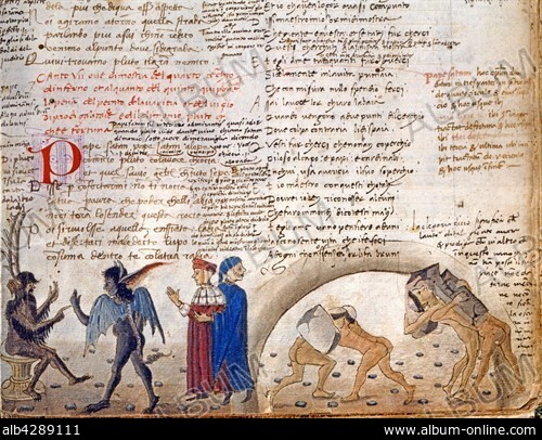 Dante Alighieri (1265-1321). Illustration from the 'Divine Comedy', Inferno (Hell), Canto VII: Dante and Virgil going into the fourth circle, where Plutus is stationed. On right, the prodigual and the avaricious roll great weights against each other.. Commented and annotated version by Arnesto Pidi (manuscript Triv.1083). 1471-1480. Manuscript on paper (308 x 215 mm). Milan, Biblioteca Trivulziana