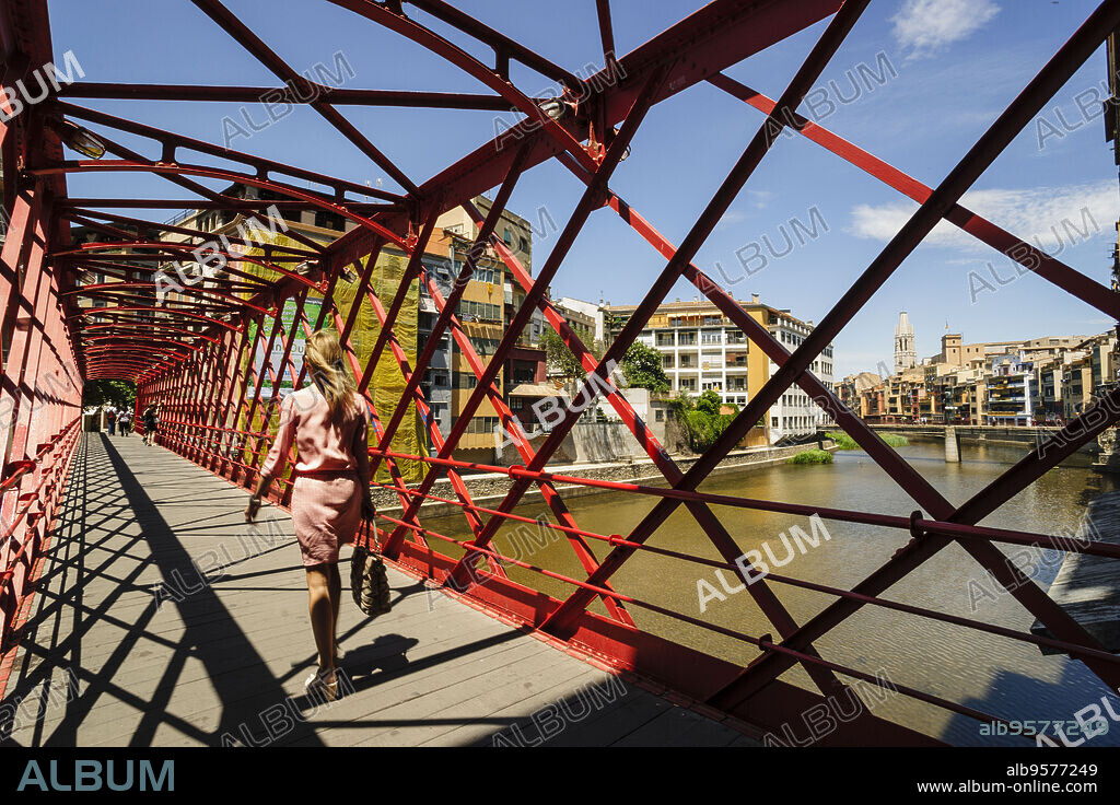puente de las Pescaterias Velles, fabricado por la casa Eiffel en 1877, sobre el rio Onyar, con la iglesia de Sant Feliu al fondo,Girona,Catalunya, spain, europa