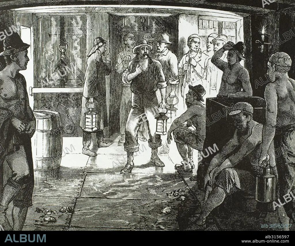 Descripción: HISTORIA DE LOS ESTADOS UNIDOS. SIGLO XIX. MINEROS EN EL INTERIOR DE LA MINA "CONSOLIDATED VIRGINIA". El principal problema de los trabajadores era el calor en el interior de las galerías de las minas. Por ello era muy importante tener un buen equipamiento para disponer de abundante agua. Grabado del periódico "Frank Leslie's" (1878) .