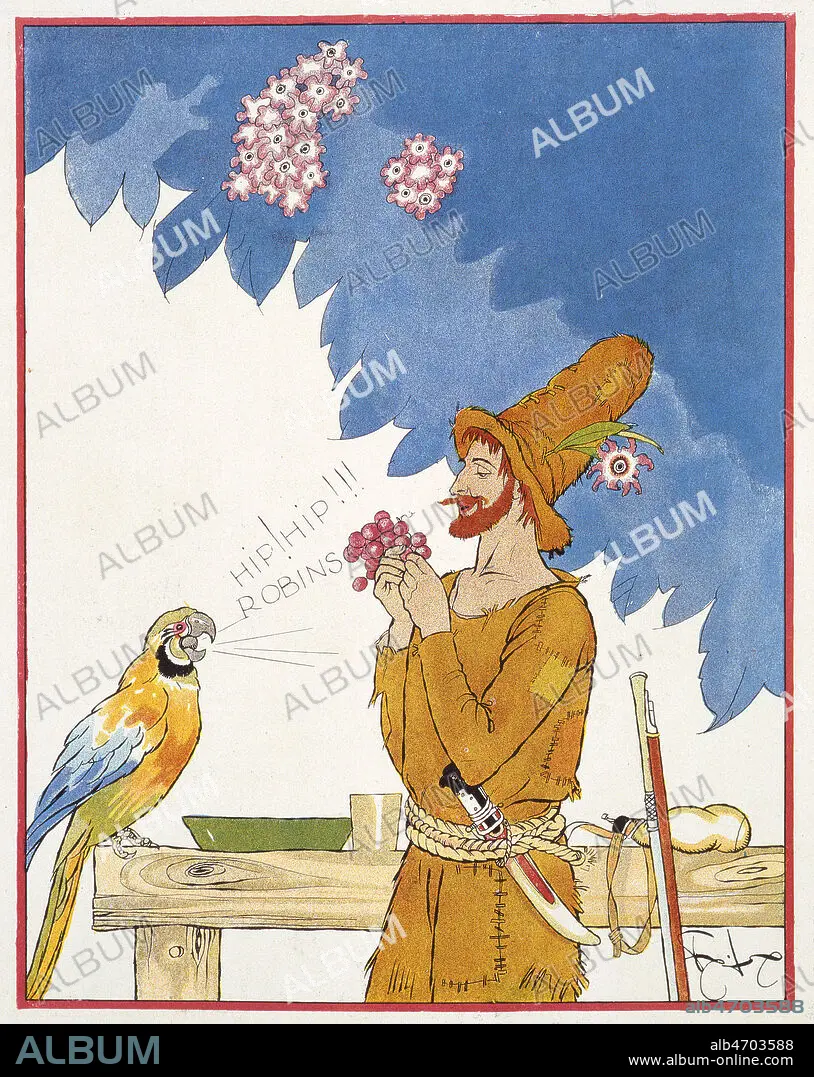 Robinson Crusoe apprend a parler a son perroquet. Illustration de 1930 par Felix LORIOUX (1872-1964) pour Robinson Crusoe de Daniel DEFOE (1660-1731). ADAGP. Credit : Coll. Jonas/KHARBINE-TAPABOR.