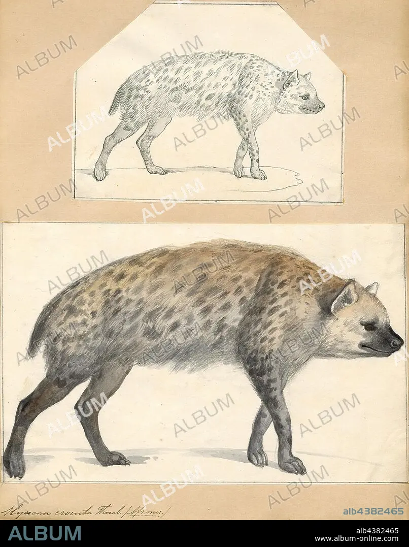 Hyaena crocuta, Print, Hyaena is a genus comprising two of the living species of hyenas: the striped hyena (Hyaena hyaena) from western Asia and northern Africa and the brown hyena (Hyaena brunnea) from southern Africa. The brown hyena has sometimes been placed in a separate genus Parahyaena, or even included in the otherwise fossil genus Pachycrocuta, but recent sources have tended to place it in Hyaena., 1700-1880