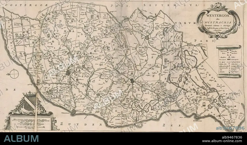 Map of the quarter of Westergo, Westergoa olim westrachia (title on object), Bottom left the coat of arms of Westergo and three scale poles: Milliare Germanicum commune quorum 15 uni gradui respondent / A gemeene Duytsche myle of 15 in a graedt, Milliare Belgicum sive hora itineris / A Nederlandtsche myle ofte uyre gaens, 1500 perticae regales. Top right title cartouche, below legend., print maker: Jacob van Meurs, (possibly), Bernardus Schotanus à Sterringa, (mentioned on object), Sjoerd Aetesz. Haacma, (mentioned on object), print maker: Amsterdam, Friesland, Friesland, Friesland, 1664, paper, engraving, height 277 mm × width 519 mm