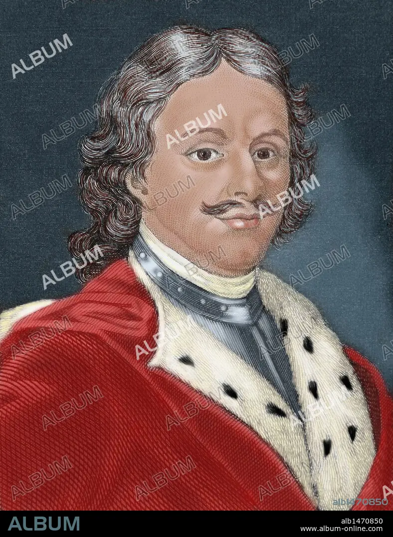 PEDRO I Alexeievitch el Grande (Moscú, 1672-San Petesburgo, 1725). Zar de Rusia (1682-1725). Creador de la moderna Rusia a la que convirtió en potencia europea. Grabado coloreado del siglo XIX.